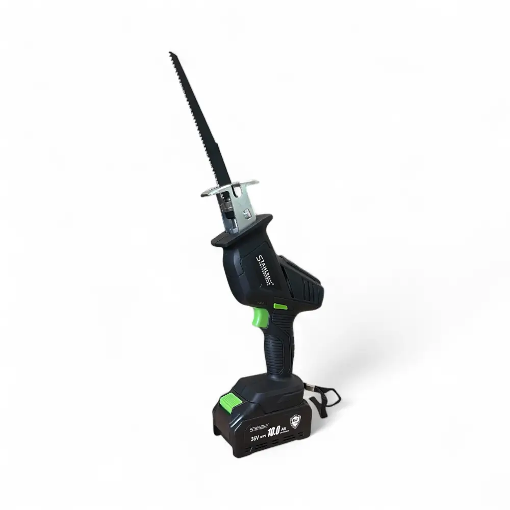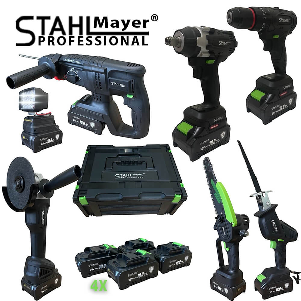 Επαναφοτιζόμενο σετ 7σε1 StahlMayer – συνδυασμένο μπουλονόκλειδο, δραπανοκατσάβιδο, γωνιακός τροχός, κρουστικό σκαπτικό, σπαθόσεγα, αλυσοπρίονο με λίπανση, LED λάμπα 36V 10Ah, βαλίτσα και εξαρτήματα.