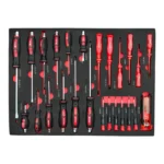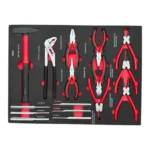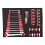 Το ντουλάπι διαθέτει 6 συρτάρια, από τα οποία τα 4 είναι πλήρως εξοπλισμένα με εργαλεία, τοποθετημένα σε EVA αφρό ανθεκτικό στο λάδι για τέλεια οργάνωση και προστασία. Είναι εξοπλισμένο με κεντρικό κλείδωμα για ασφάλεια και οδηγούς ρουλεμάν στα συρτάρια, που εξασφαλίζουν ομαλή και απρόσκοπτη λειτουργία. Το επιπλέον πλευρικό διαμέρισμα για λάδια και αναλώσιμα προσφέρει μεγαλύτερη ευκολία και χώρο αποθήκευσης.